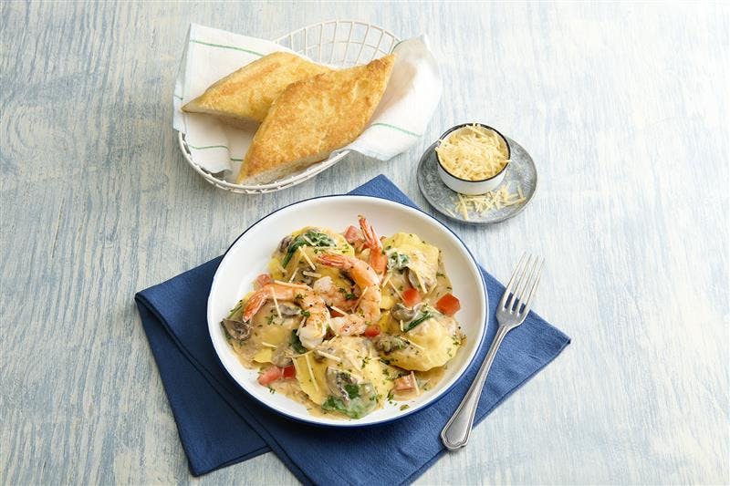 Shrimp, Mushrooms, Spinach, Wine, Gremolata Butter Sauce, Garlic Bread